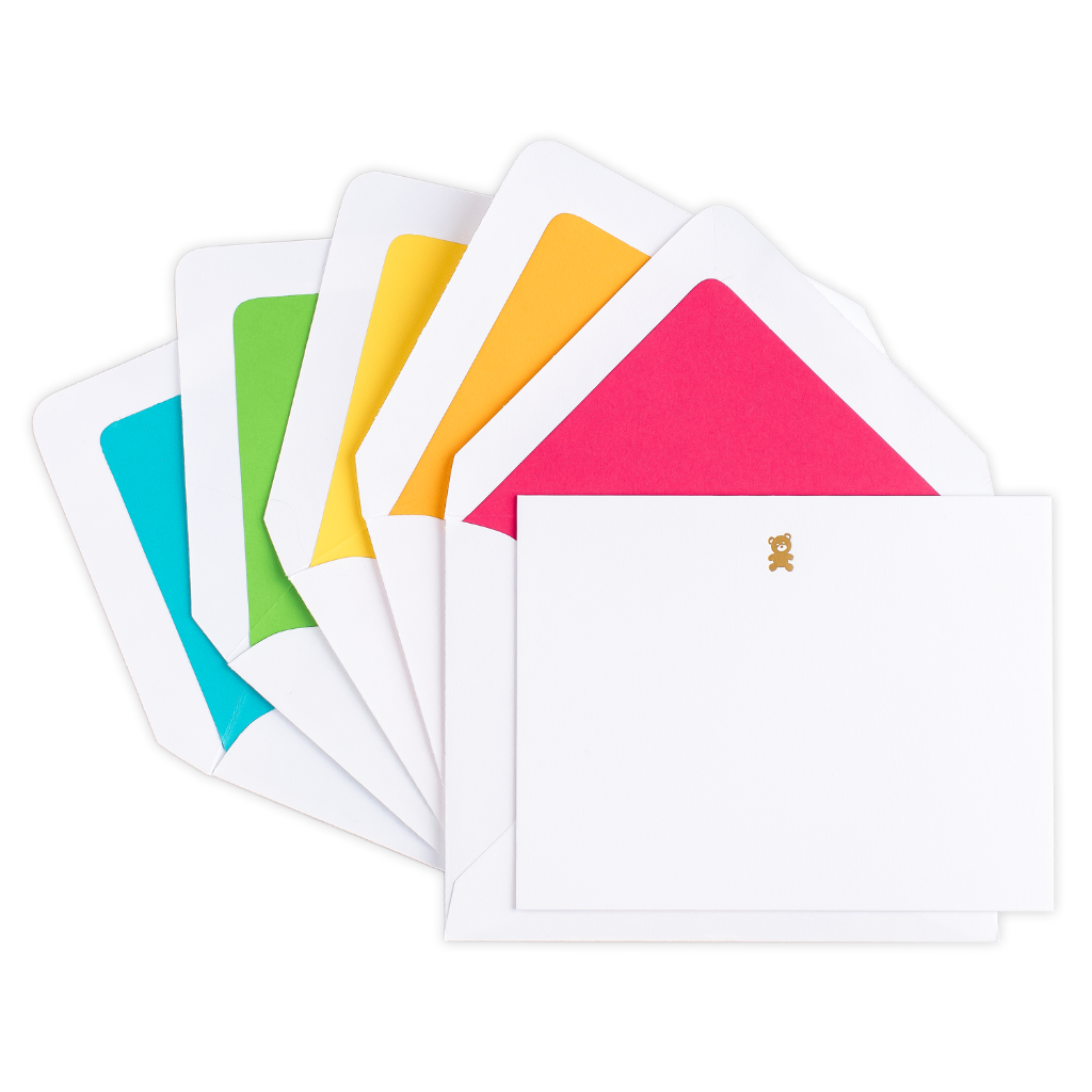 Each Gold Foil Teddy Bear boxed set contains 10 letterpress note cards featuring the silhouette of everyone’s favorite cuddly companion in antique gold foil. All cards are letterpress printed by hand on antique machinery and paired with white envelopes featuring a solid liner in either turquoise, yellow, hot pink, lime green, and orange. Made in America and hand lined.