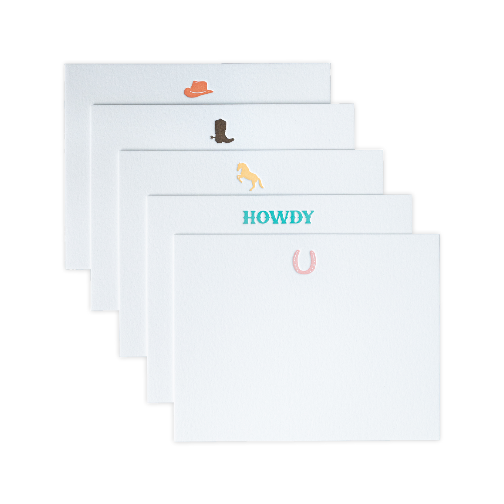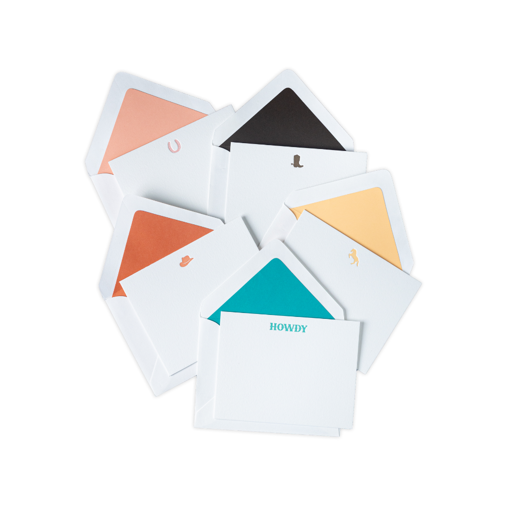 From the heart of Texas, say howdy to Cowgirl Country. Inspired by our hometown of Dallas, this luxe letterpress note card set features our favorite ranch-inspired motifs and captures what we feel makes the Wild West so special.