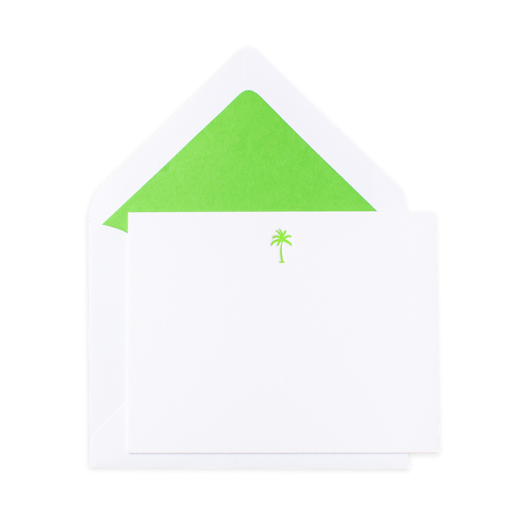 Find your own slice of paradise with our Palm Tree Perfection note cards! This boxed set features 10 lime green palm trees letterpress printed by hand on antique machinery. Each crisp white card paired with crisp white envelopes featuring matching lime green solid liners. Made in America and hand lined.