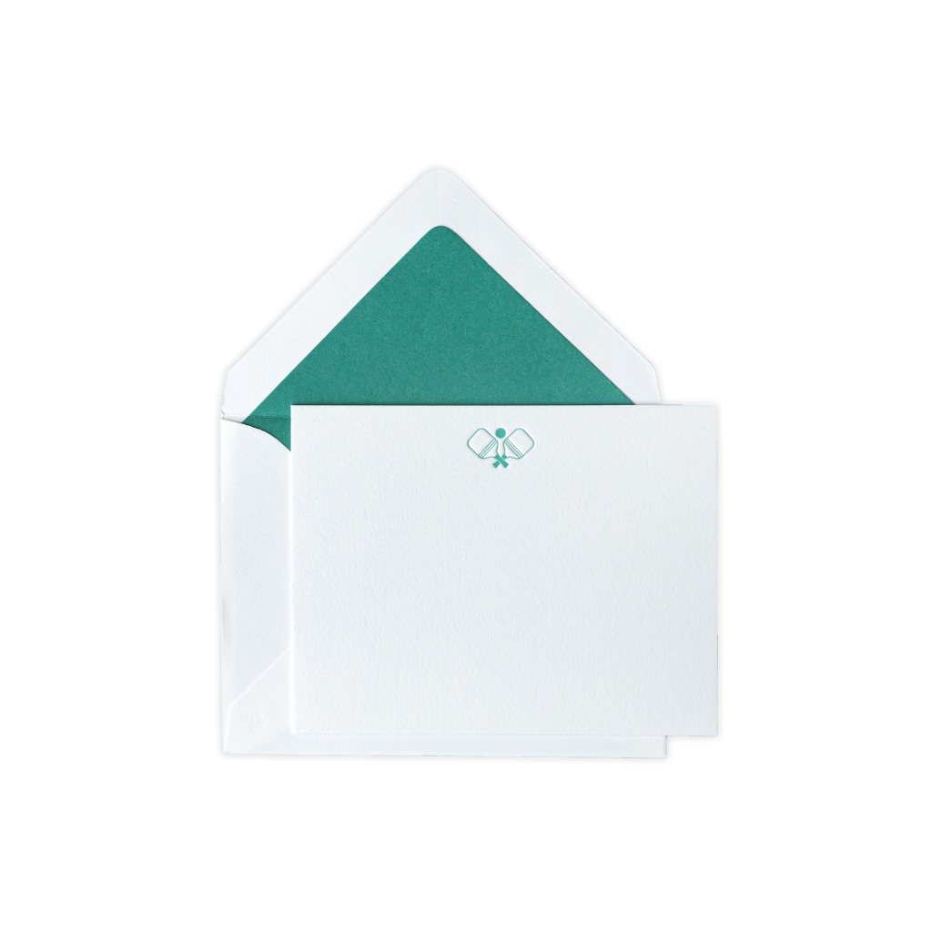 Each Pickleball Pairs boxed set contains 10 letterpress note cards featuring pickleball paddles in Bermuda green. All cards are letterpress printed by hand on antique machinery and paired with white envelopes featuring a solid liner in matching Bermuda green. Made in America and hand lined.