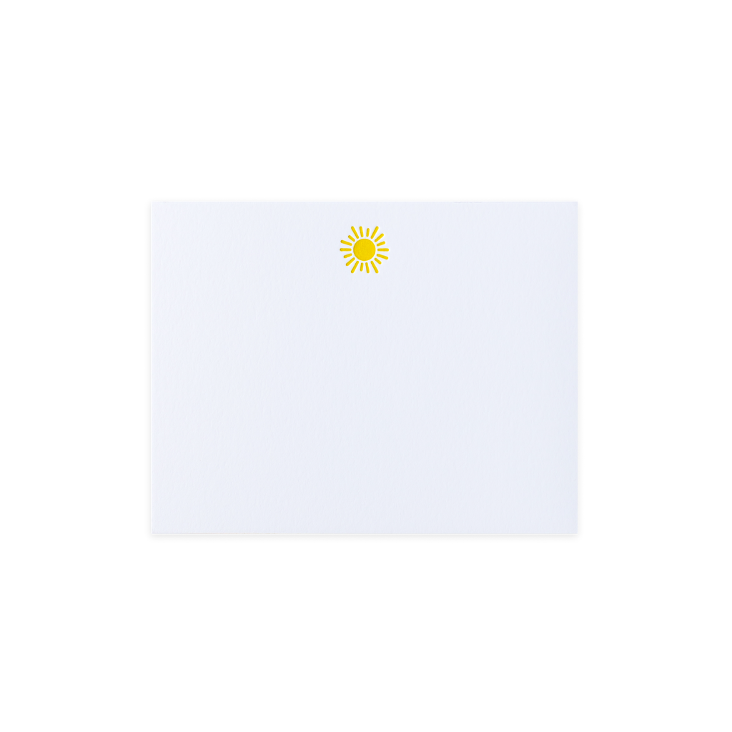 Here comes the sun with our Sending Sunshine note cards! This boxed set features 10 bright yellow suns letterpress printed by hand on antique machinery. Each crisp white card paired with crisp white envelopes featuring matching bright yellow solid liners. Made in America and hand lined.