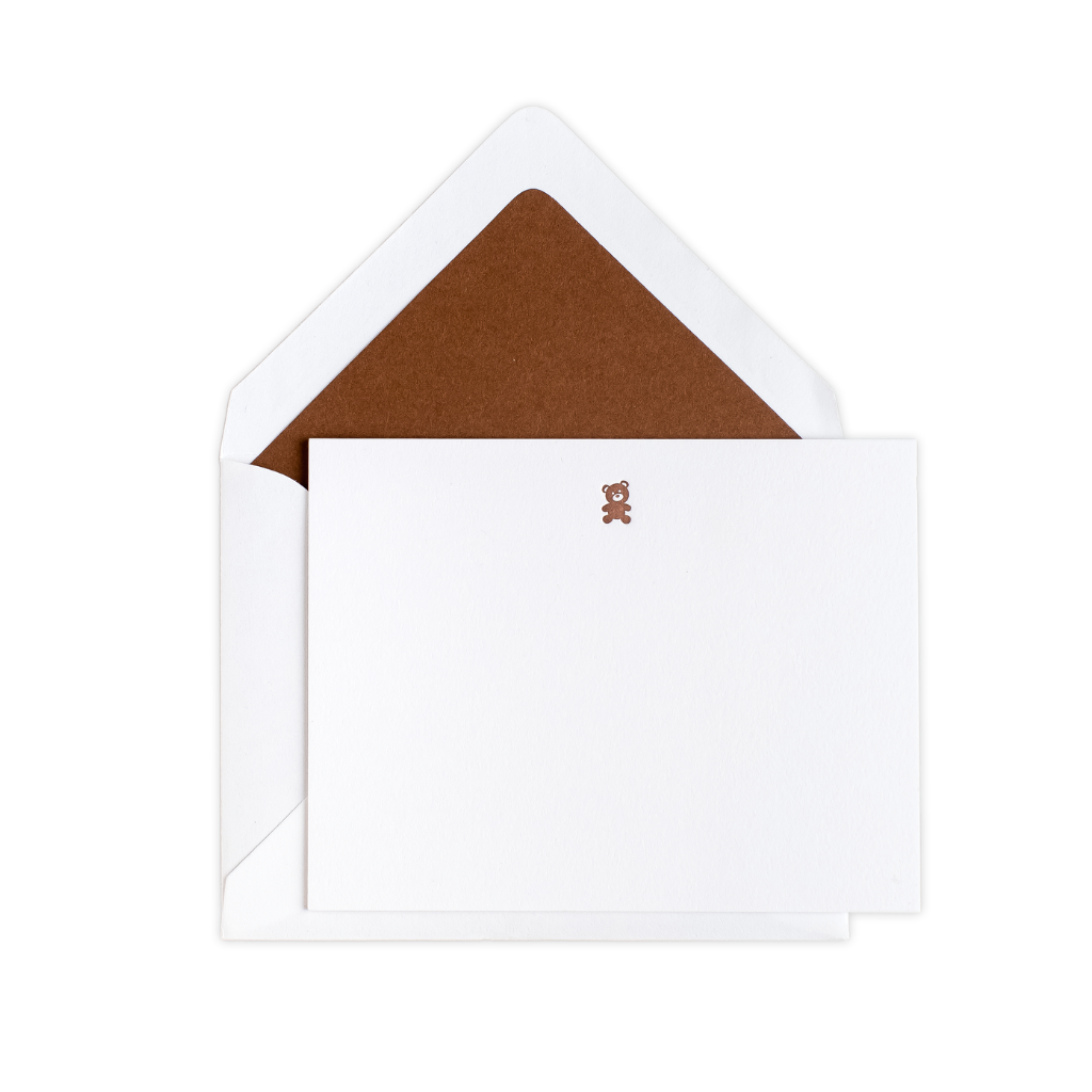 Each Teddy Bear boxed set contains 10 letterpress note cards featuring the silhouette of everyone’s favorite cuddly companion in brown ink. All cards are letterpress printed by hand on antique machinery and paired with white envelopes featuring solid liners in a matching shade of brown. Made in America and hand lined.