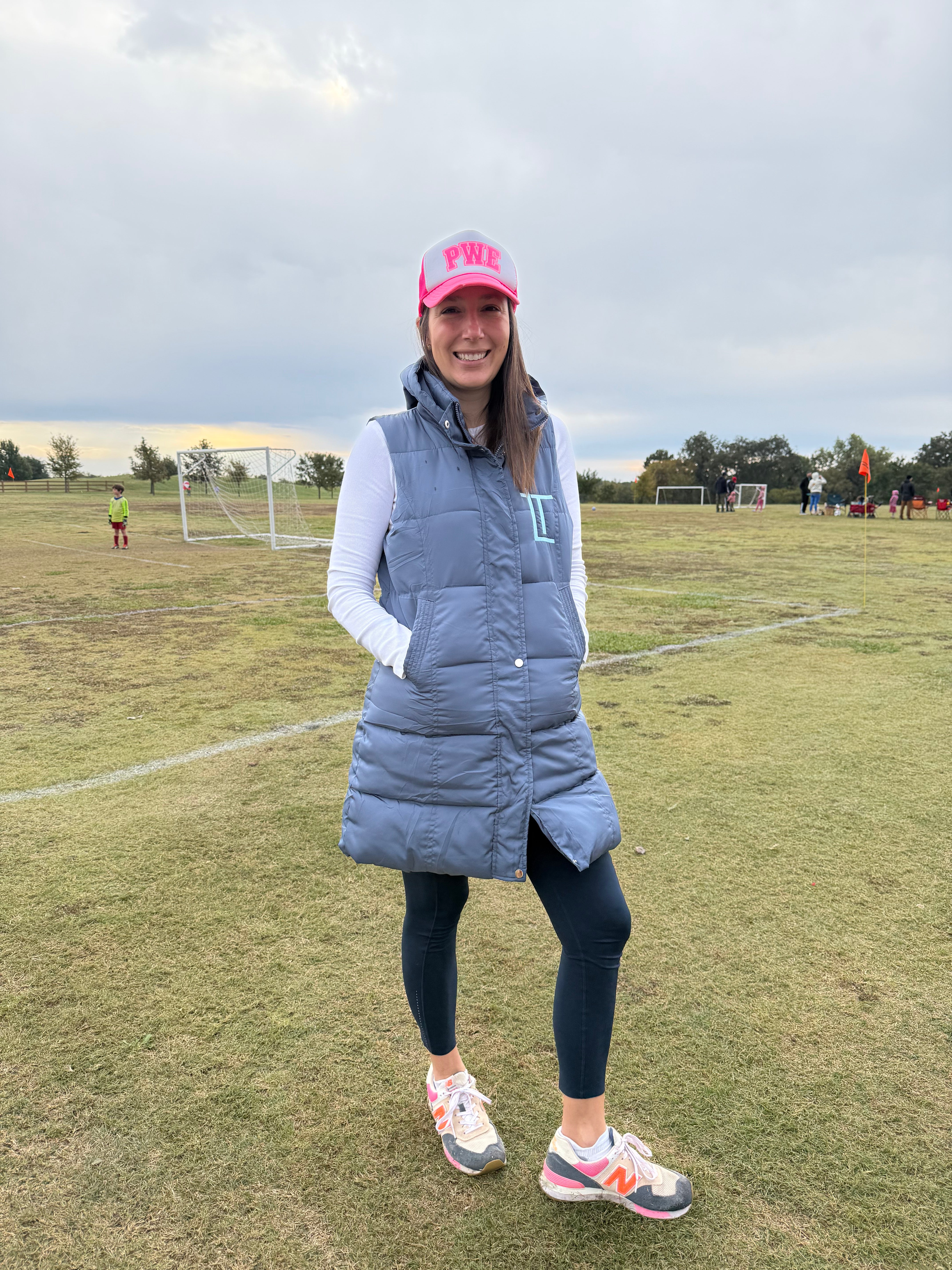 Perfect for the Fall or Spring (or really Winter in Dallas!) - our long puffer vest is mid-length - has a detachable hood with a zipper closure and two side pockets.  Great for running errands or sitting out at your cute kiddos games!