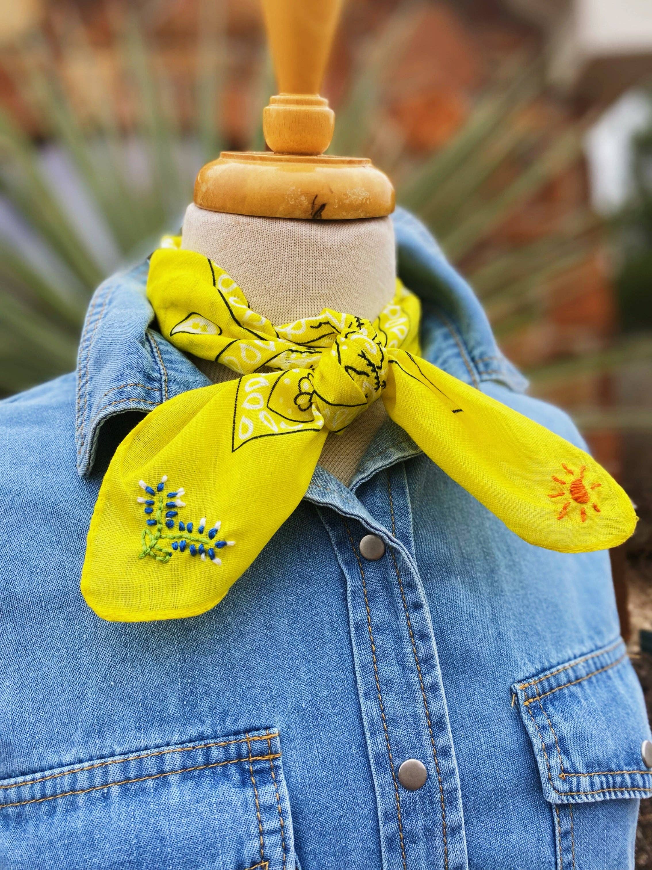 It’s all in the details. Each bandana is hand drawn and hand embroidered with love just for you. No two will be exactly the same. You can wear around your neck or in your hair. Tie one on your fav bag or around the neck of your favorite dog! Choose from various colors. Care- wash in cold water. Hang dry 21” x 21”