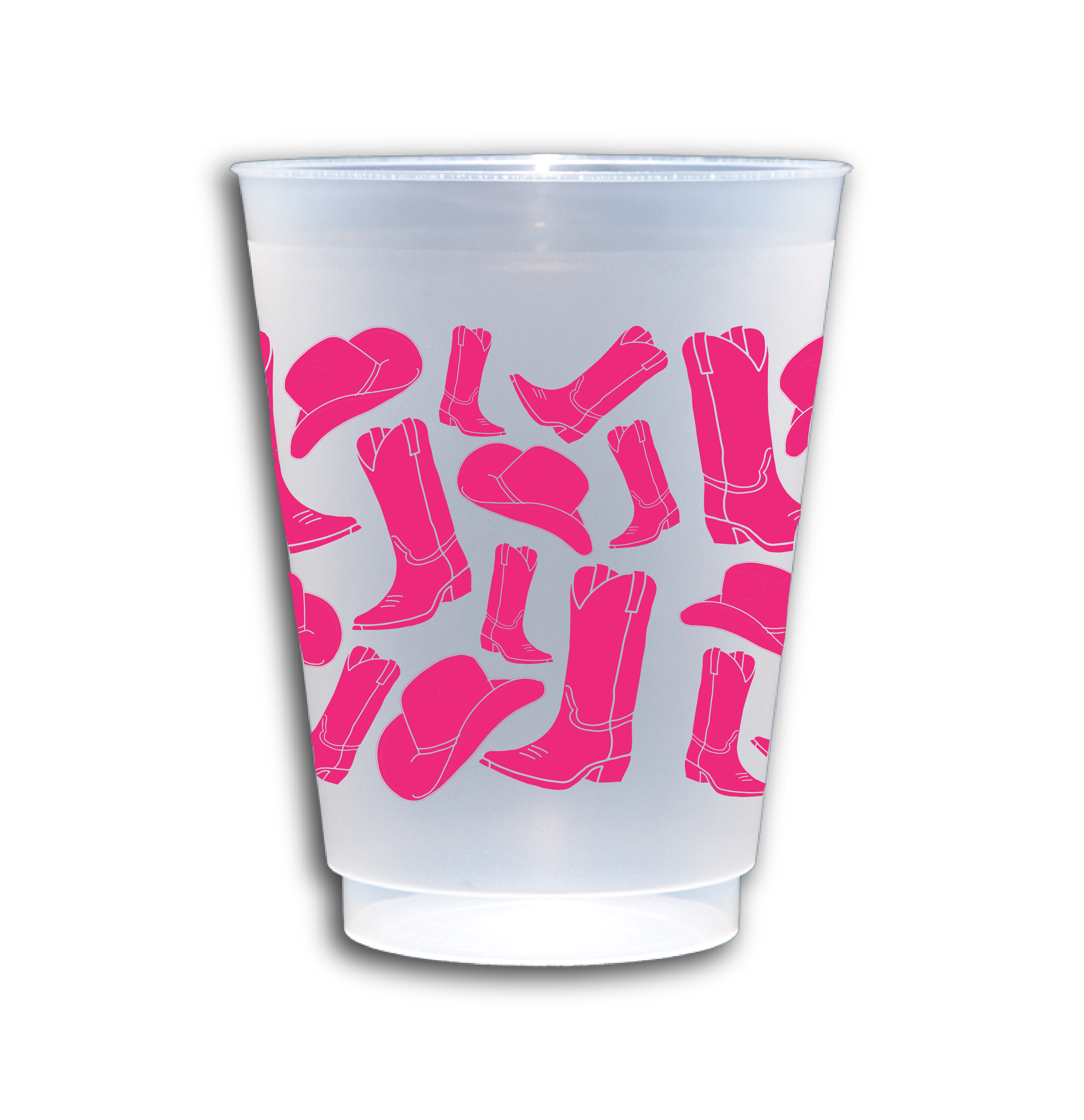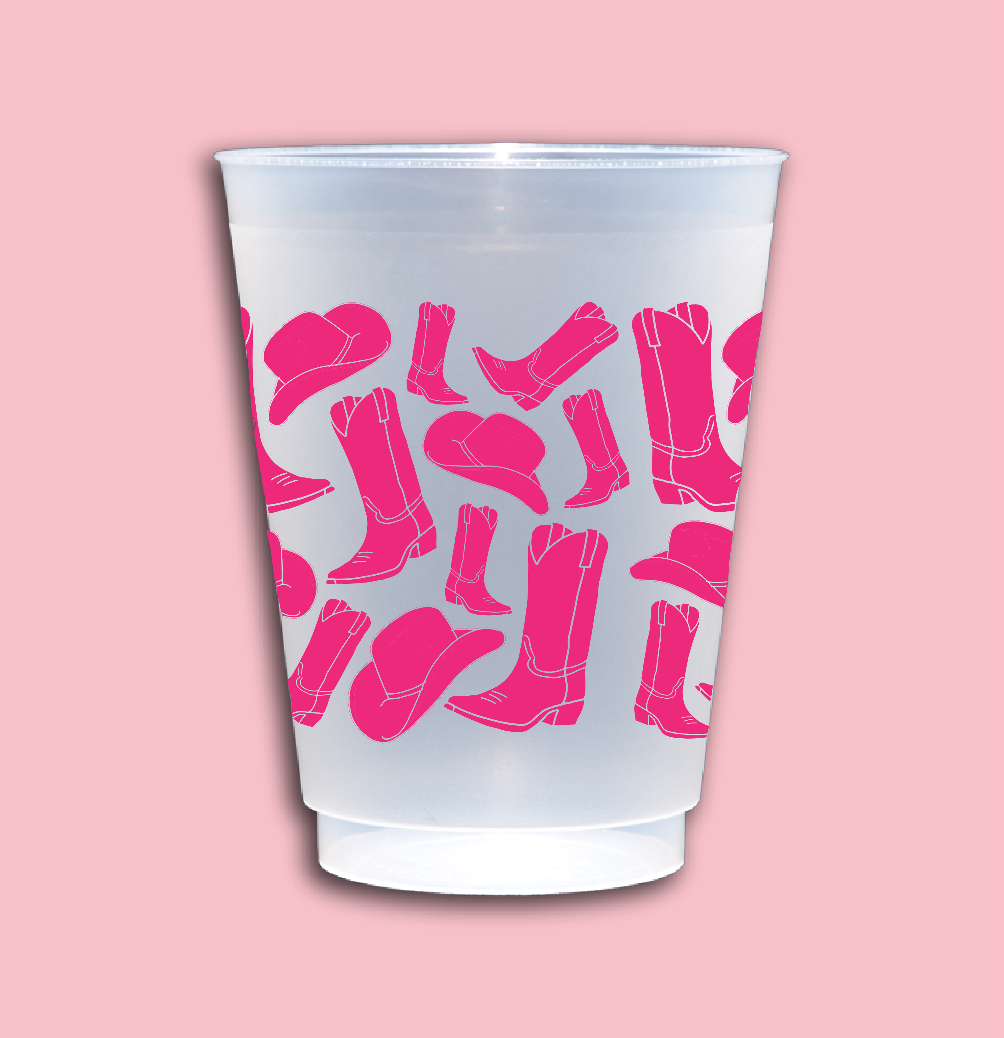 Our Cowgirl Party Cup is perfect for everyday use or entertaining - from birthday parties to bachelorette parties and more! The cups feature hot pink cowboy boots and cowboy hats scattered around the cup. Cups come in a cellophane sleeve with a black and white striped ribbon tied in a bow at the top. SPECS: - Set of 8 Cups - 16 ounces - Frosted Shatterproof - Top Rack Dishwasher Safe - BPA Free - Recyclable - Made and Printed in the USA